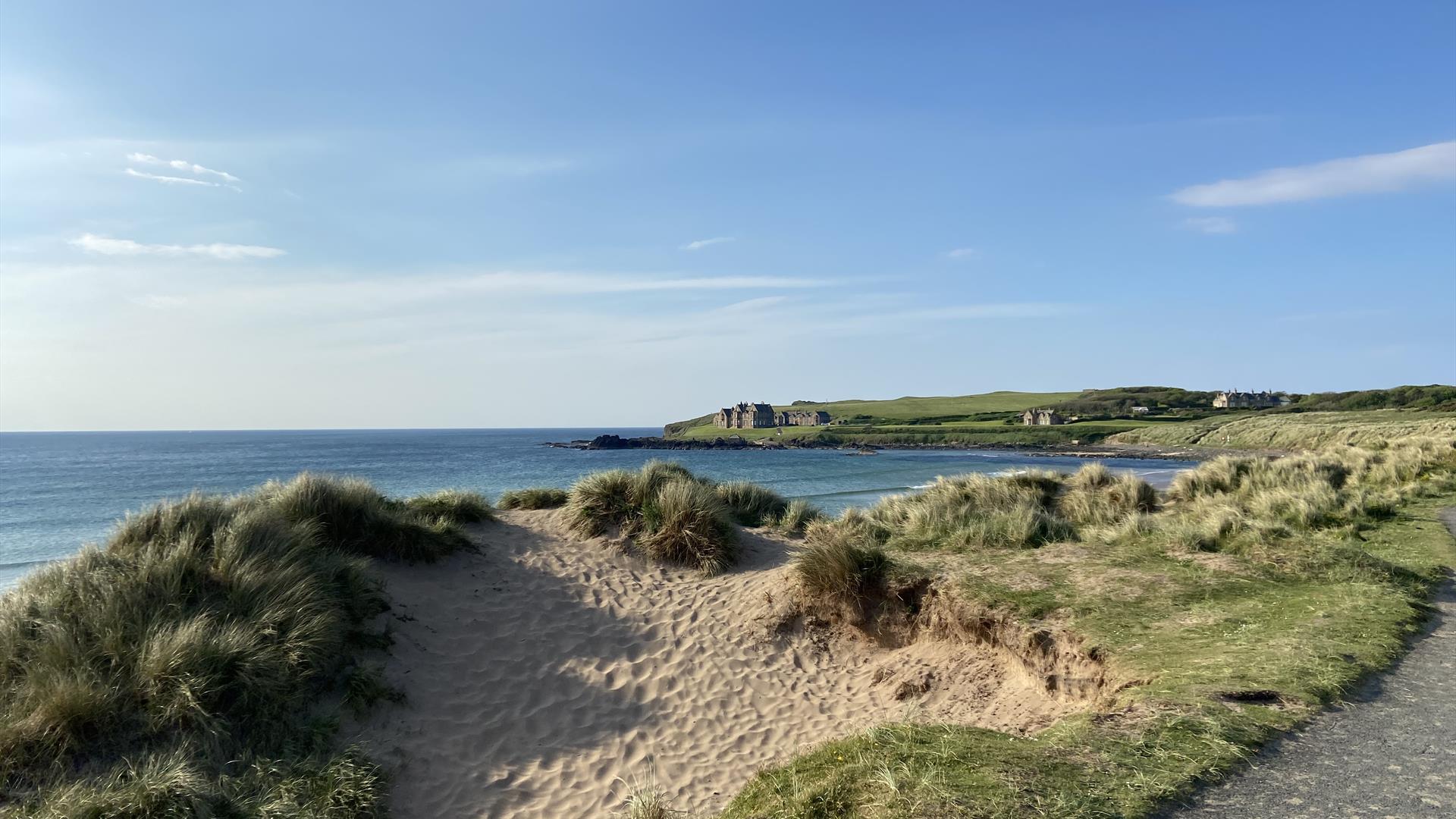Having crossed the bridge, turn right onto a wooden boardwalk that traces the bank of the river. At a junction with a gravel path, turn left. You now pass through an extensive sand dune system, walking beside the track of the Giant’s Causeway and Bushmills Railway. Cross the tracks twice to reach a wooden gate, where you should turn left. Follow this path towards the beach, then veer right and descend across a footbridge at the end of the sand.