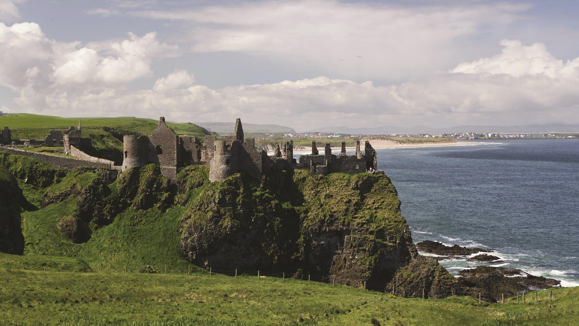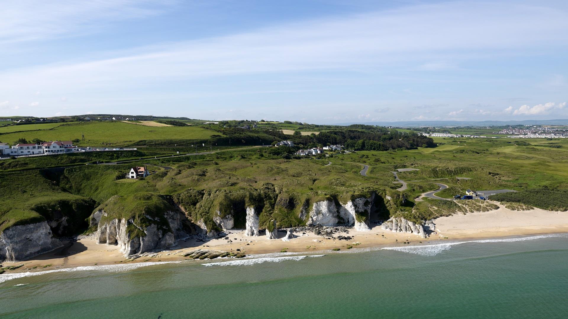 Set out along the beach, in the shadows of the world famous Royal Portrush Golf Course, following the sand for over 2km to reach the parking area at White Rocks Coastal Park. This area derives its name from the striking limestone cliffs that line the back of the beach. Follow the route markers along the cliff path, culminating in a viewpoint perched on the seaward side of the main coast road. Having taken in the spectacular panoramic coastal views, continue towards Dunluce Castle and onto Portballintrae.
