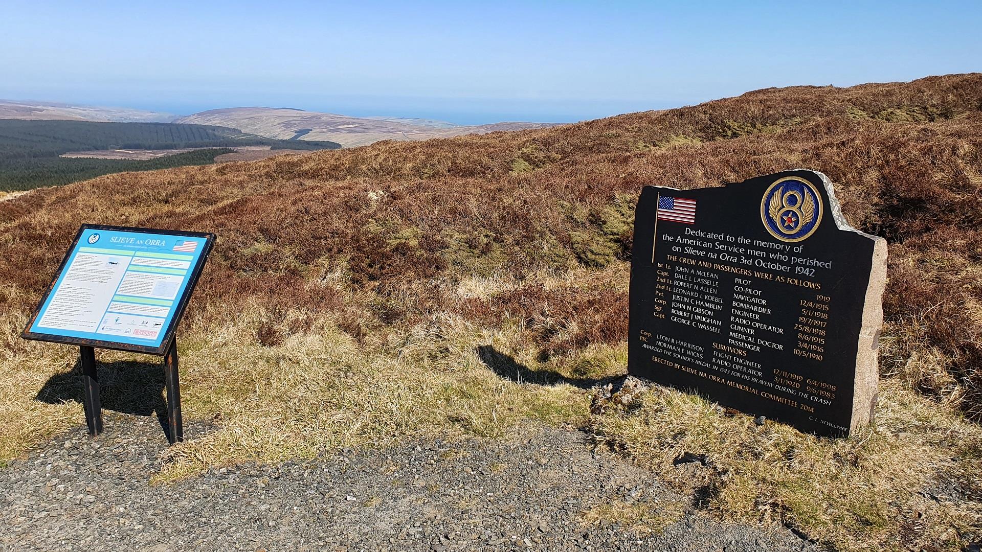 The track becomes steeper and twists through several switchbacks on the final ascent towards the summit. Walkers pass a small monument commemorating a tragic event during WWII. In October 1942, a US Air Force B17 Flying Fortress bomber, making a trans-Atlantic flight bound for Prestwick, crashed into the mountain during poor visibility killing 8 of the 10 personnel on board.