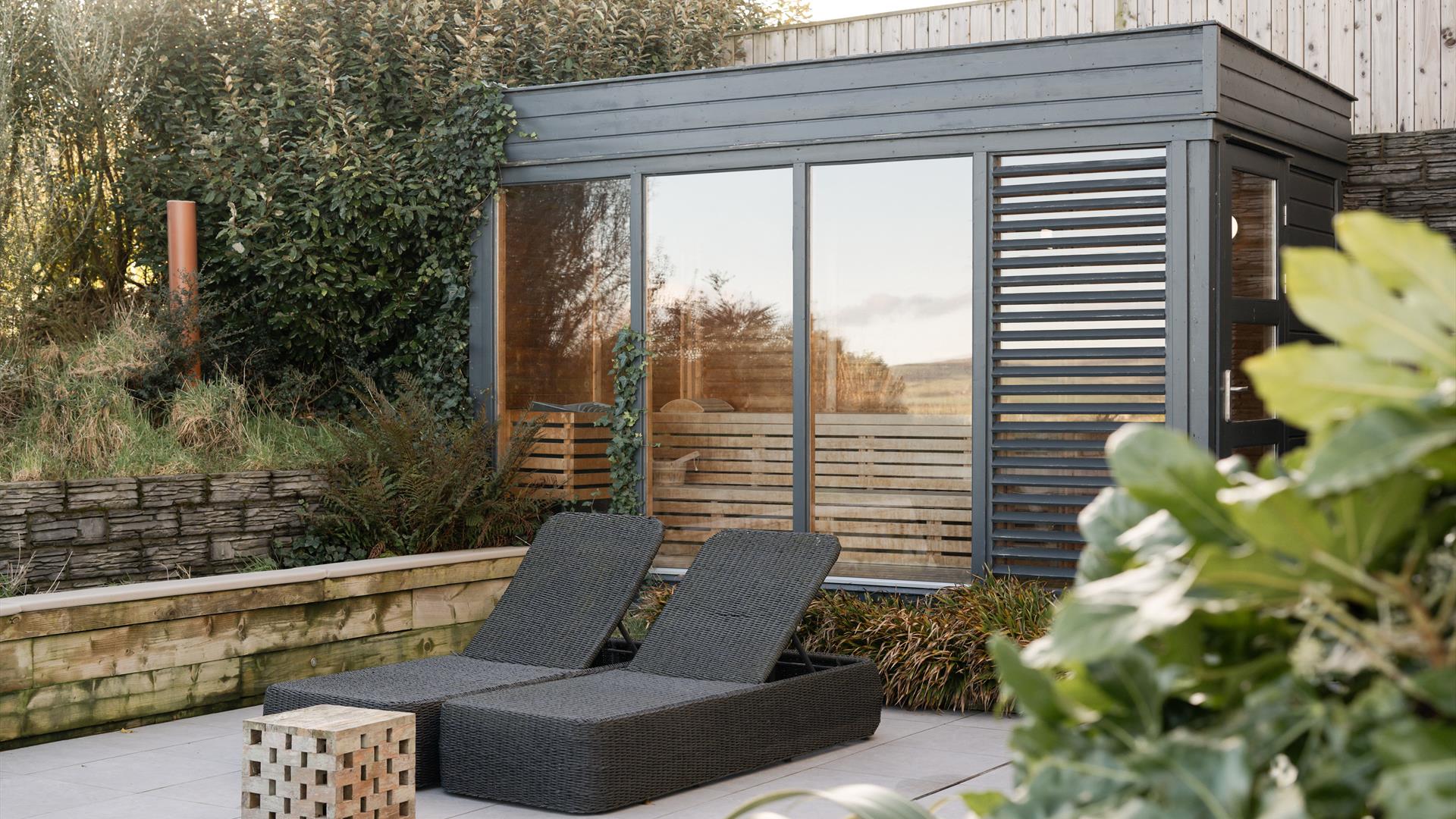 Heated Day Bed & Relaxation Area - in a space of relaxation, rest on day beds or the gently-heated day beds and enjoy views of Fairhead.