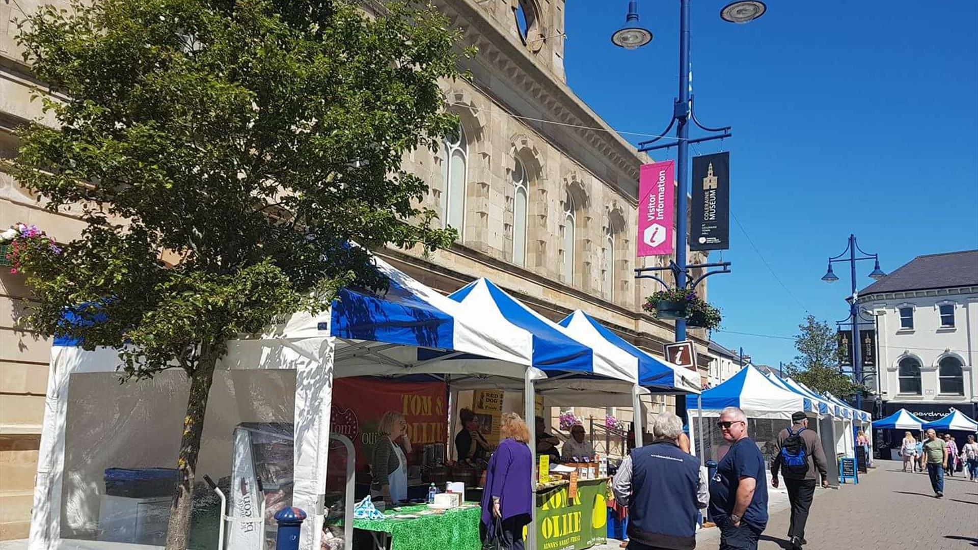 The Causeway Speciality Market is a bustling, speciality food and craft market held in Coleraine Town Centre – located around the Town Hall, a magnificent 150-year old sandstone building in the Diamond area of the town centre. The Market takes place on the second and fourth Saturday of each month from 9am to 4pm.